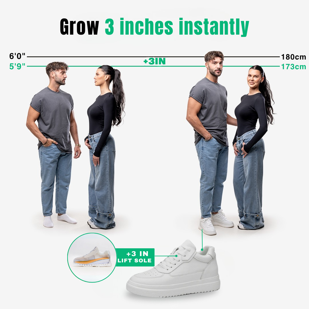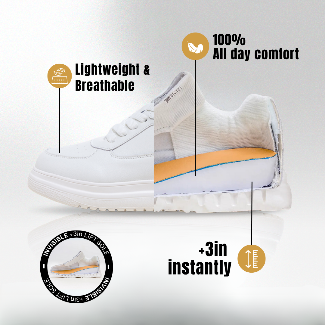 Elevate your style with CLOUD X, the height-increasing sneaker that blends modernity, elegance, and discretion. Instantly gain 3" in height with its innovative sole while enjoying unmatched comfort. Its sleek design, available in two colors, seamlessly complements both casual outfits and professional looks. Crafted from premium materials, it offers a perfect combination of durability and sophisticated appeal. Ideal for achieving a taller silhouette and boosted confidence, CLOUD X is your ultimate ally for making a lasting impression.